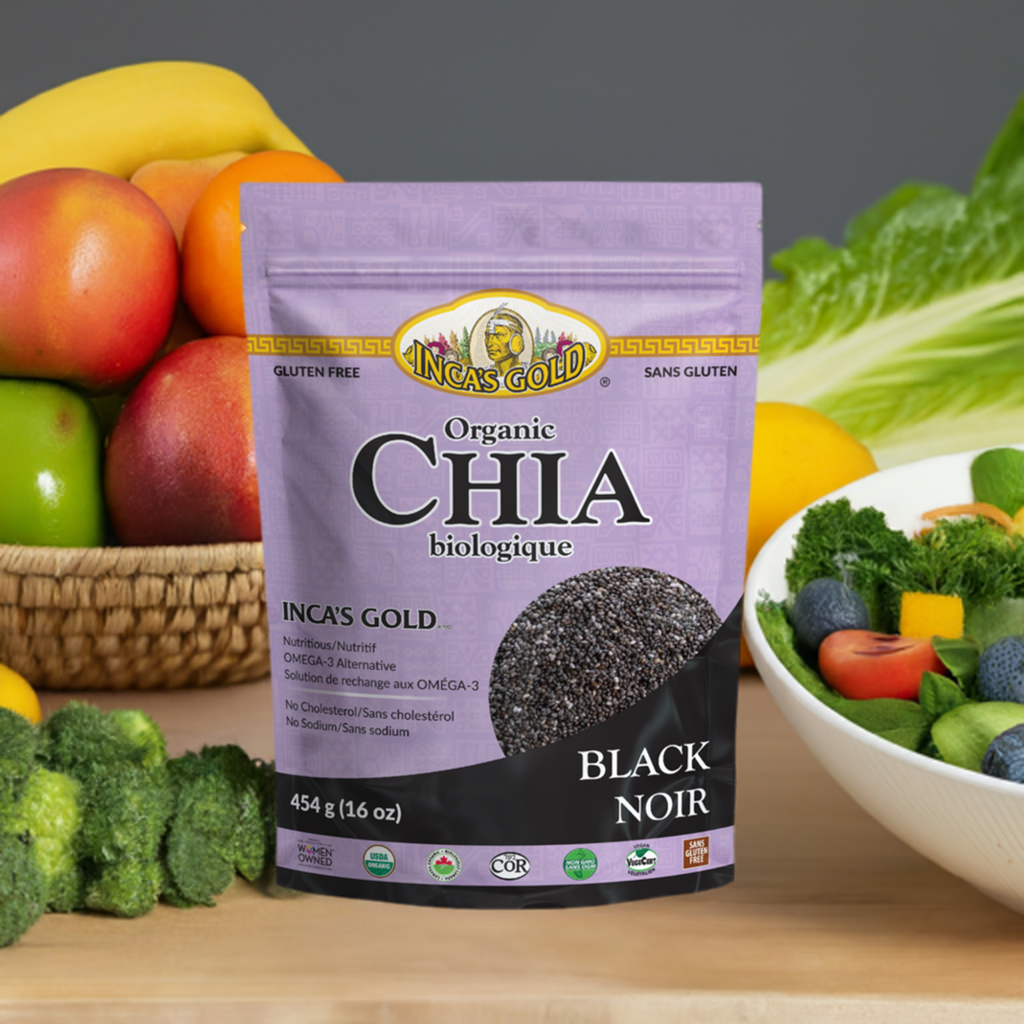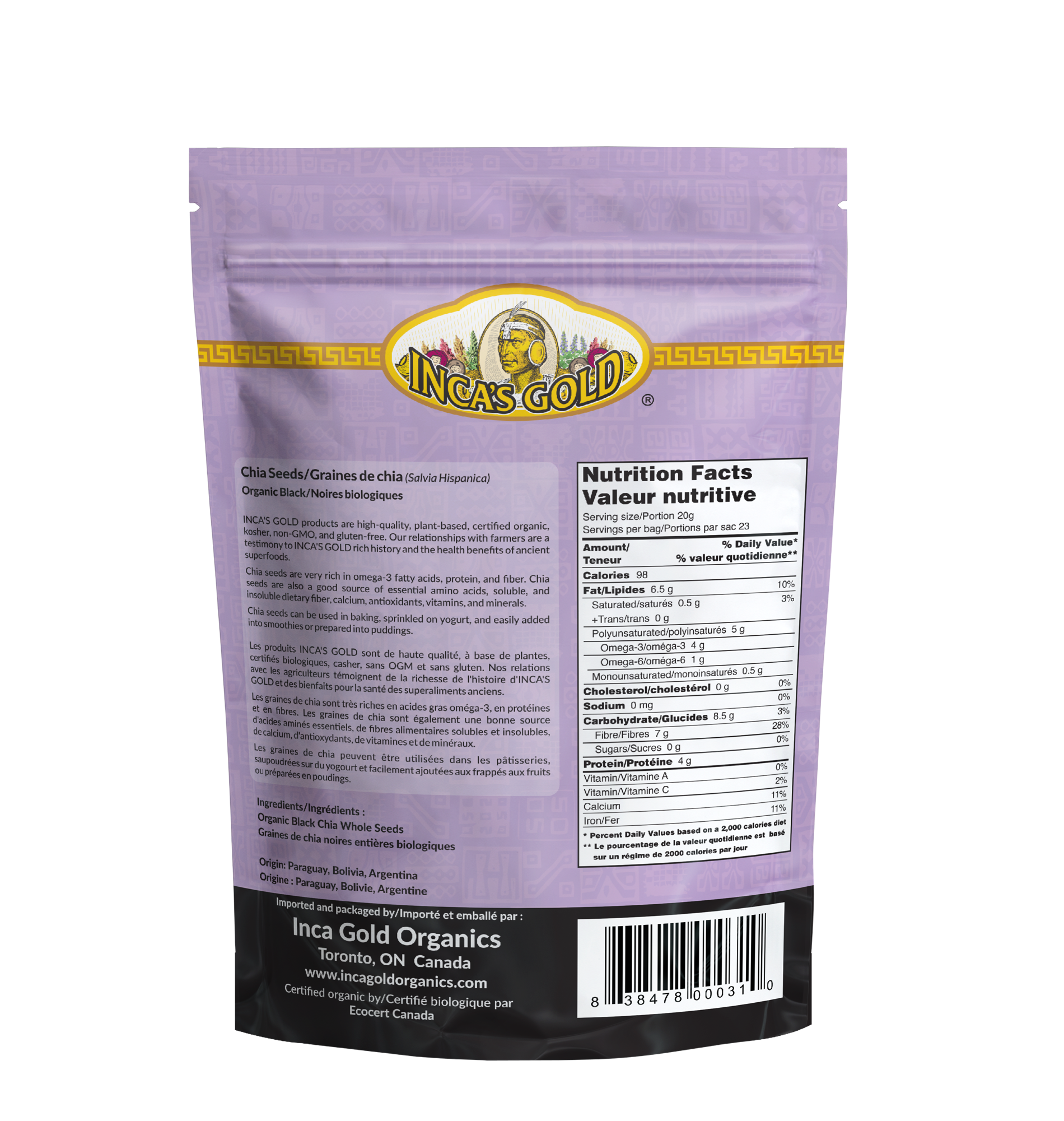 Chia Seeds contain all essential amino acids, are low glycemic-index and extremely rich in omega-3 fatty acids, antioxidants, calcium, protein as well as both soluble and insoluble dietary fiber. Our Organic Black Chia Seeds are also free of gluten, cholesterol, sodium and lactose.