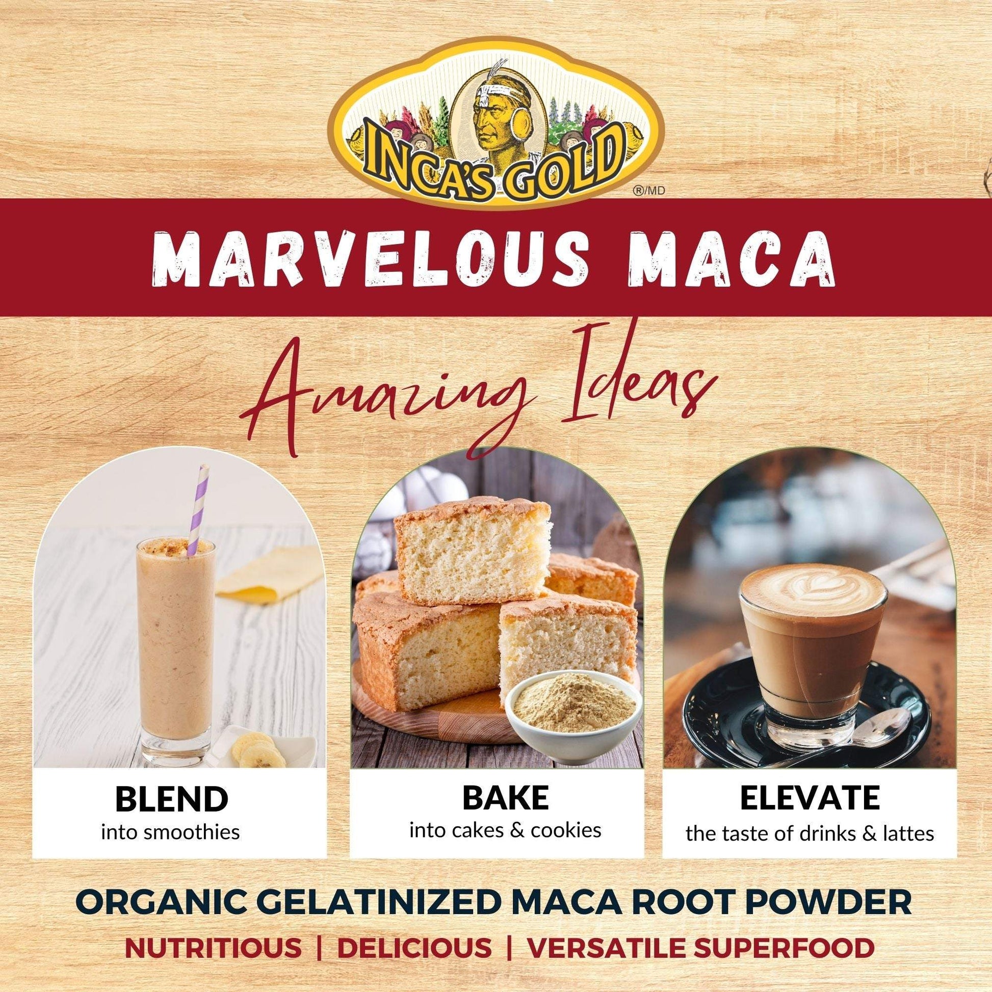 You can enjoy our Organic Red Maca Powder by itself, mixed with water, juices and shakes or add it to your baking recipes.