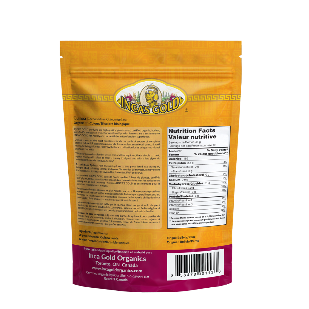 Quinoa is one of the most nutritious foods on the planet. It is native to the Andes and was sacred to the Incas, who called it the “Mother of all grains” for its nutritional properties. Inca's Gold Organic Quinoa is 100% organic, non-GMO, gluten and cholesterol free, very low-glycemic index, twice washed and easy to cook and digest.